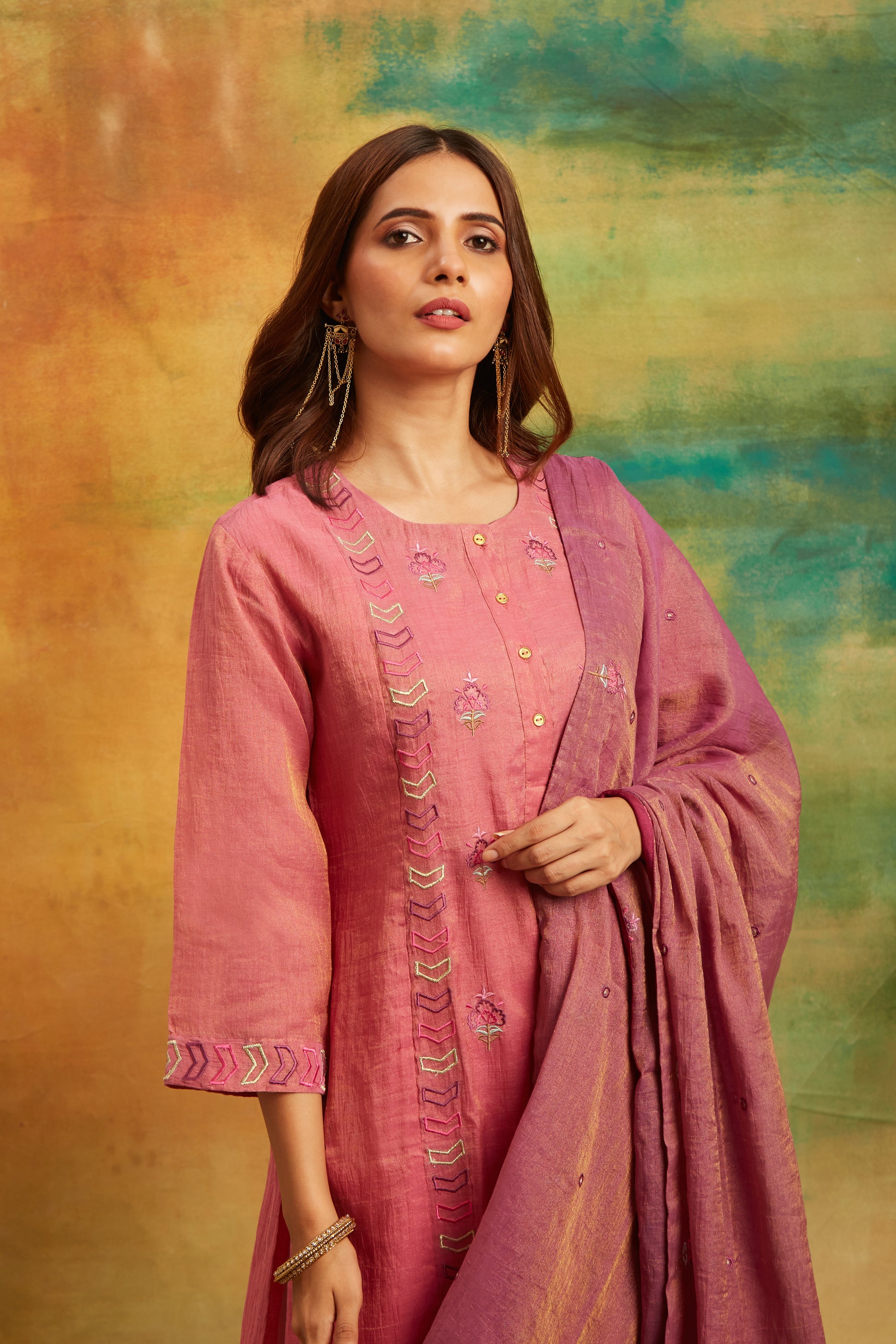 Phooll (metal) has its own beauty & shine same as this zari chanderi set has…….! This mild gold shine enhanced its beauty and make it more royal.